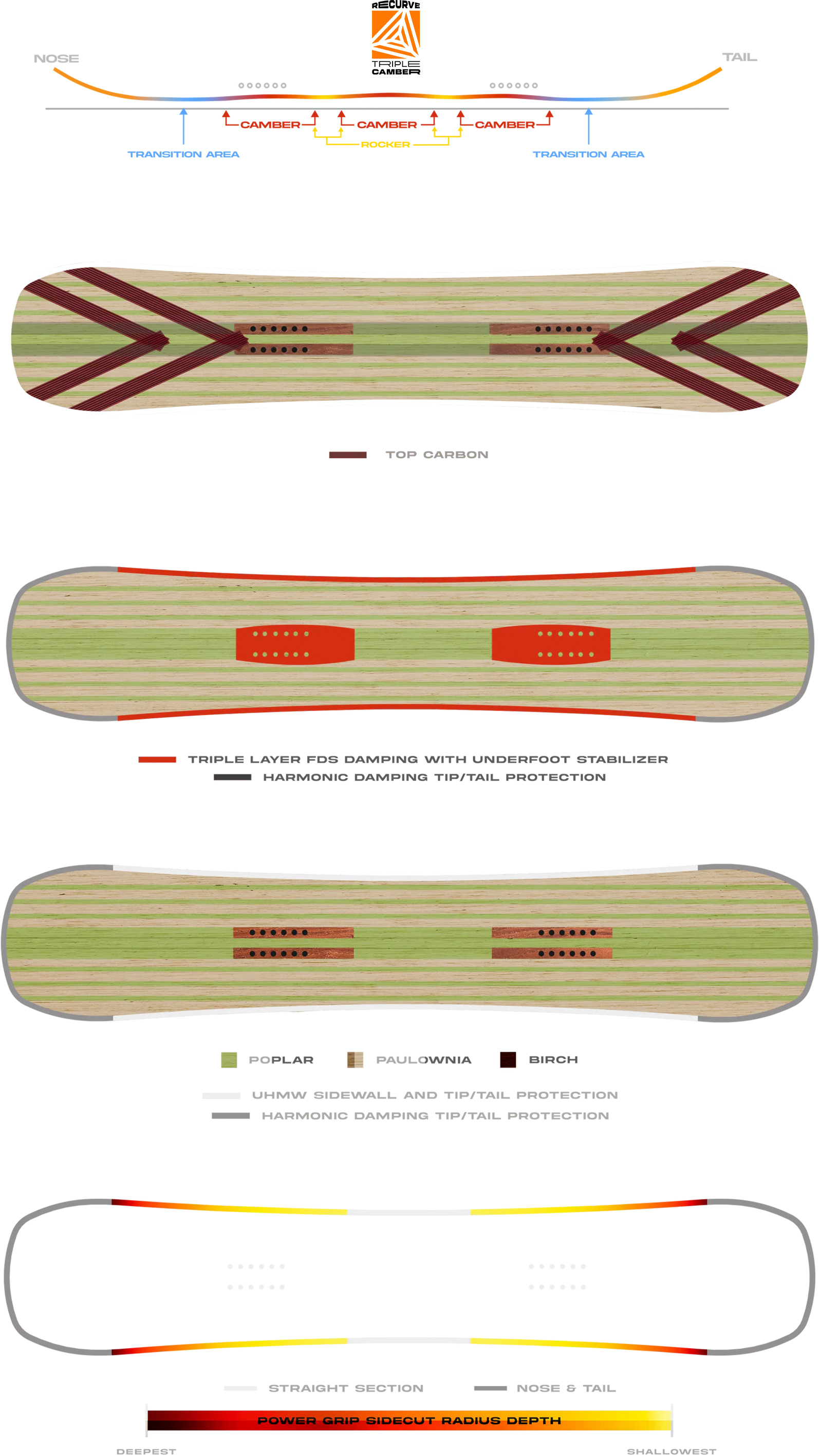 - Triple Camber Recurve Profile - innowacyjny profil, który pozwala na dynamiczną jazdę i łatwe wykonywanie tricków.