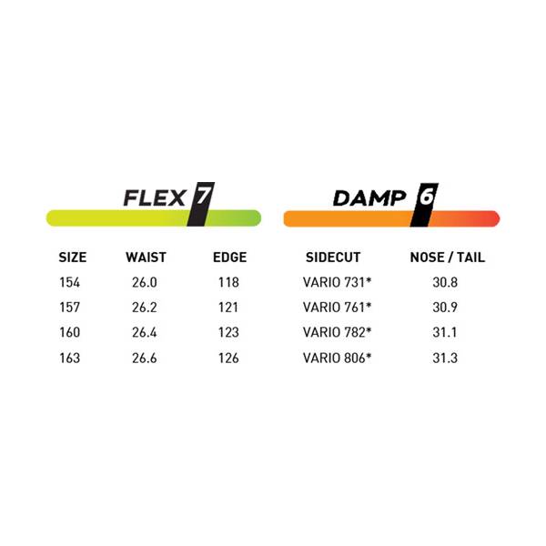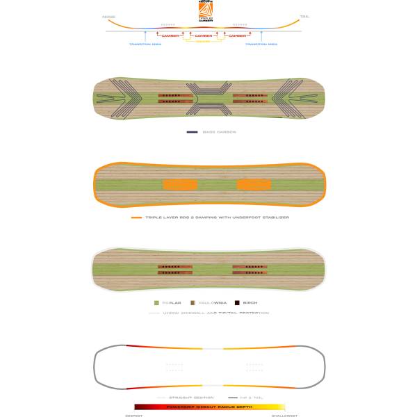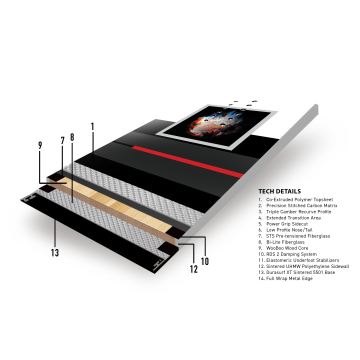 - Triple Camber Recurve Profile - innowacyjny profil, który łączy tradycyjny camber z mikrosekcjami rockera, poprawiając stabilność i ułatwiając skręty.